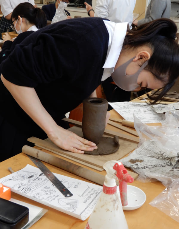 <1年生> 多くの素材に触れながら、感受性を養う。 内容:風景画、理想の部屋のシャドーボックス、色相環、四季のデザイン <2年生> 自分を見つめる。 内容:自画像と自分を取り巻く環境の構成、寄木細工 <3年生> 広い視野への展開。 内容:言葉からイメージする絵画、陶芸と和紙によるランプシェード