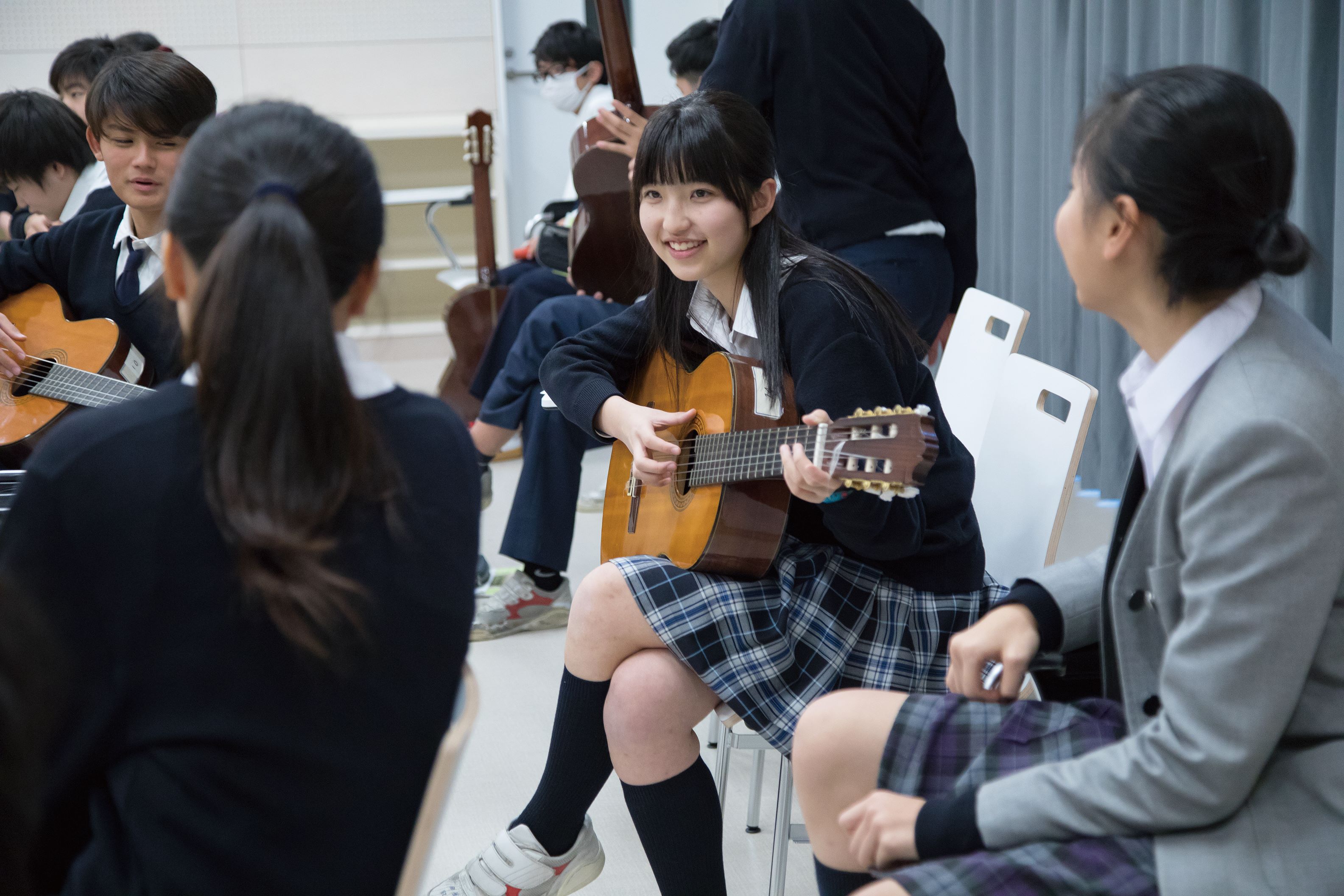 音楽の好みが分かれてくる時期であるが、個々の能力が発揮できる環境(ギターの導入等)を整え、さらに良き感性・想像力を育むこと。音楽の基礎として、音楽には長調と短調があることを学び、高等部で学ぶ音楽につながりをもたせる。