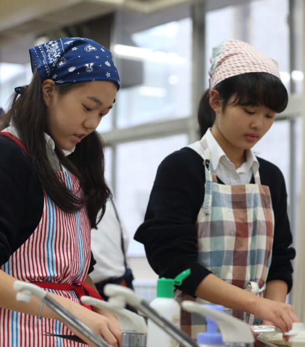 家庭科…衣生活では製作基礎、エプロン製作をミシンで行う。食生活では食品の選択と購入を中心に食生活に必要な知識と技術を学ぶ。