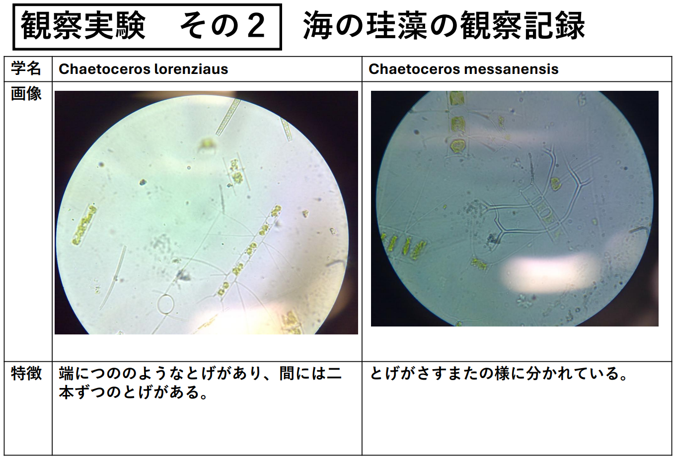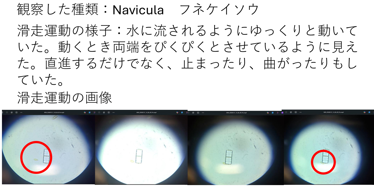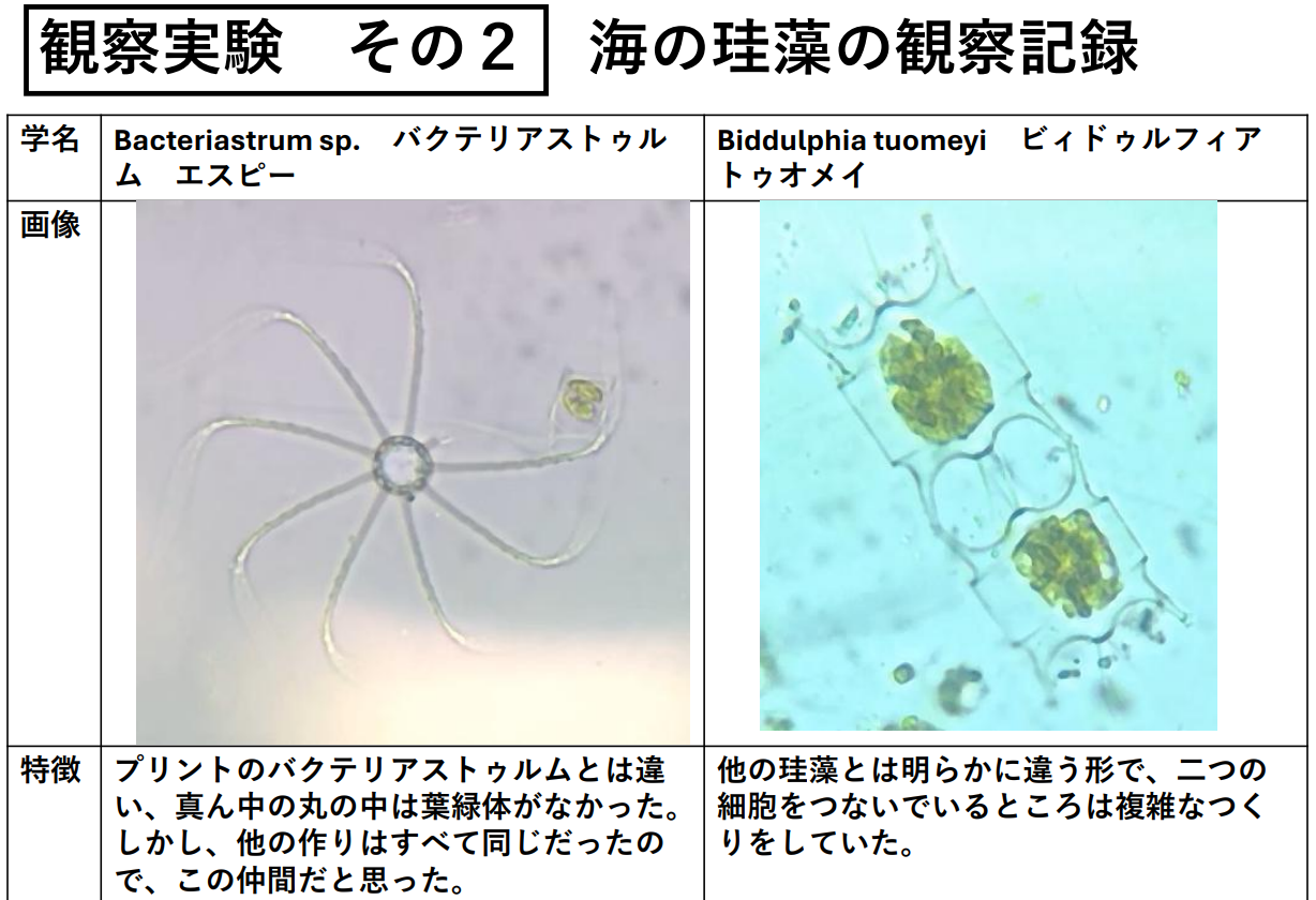 「多種多様な珪藻を観察することは本当に楽しく、まだ探していたいと思いました。家の水槽についていたコケが珪藻だと知って驚きました。また、水槽内の珪藻を採取して観察するのも面白そうだと思いました。」