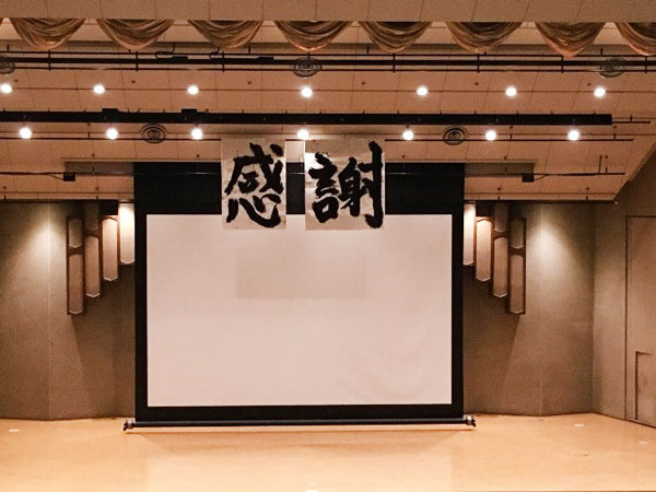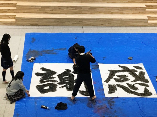 また、これまでお世話になった先輩方へのメッセージとして、140cmの大きな筆で書いた「感謝」の文字を飾りました。作成にはいろいろ苦戦しましたが、とても迫力のあるものに仕上がりました。