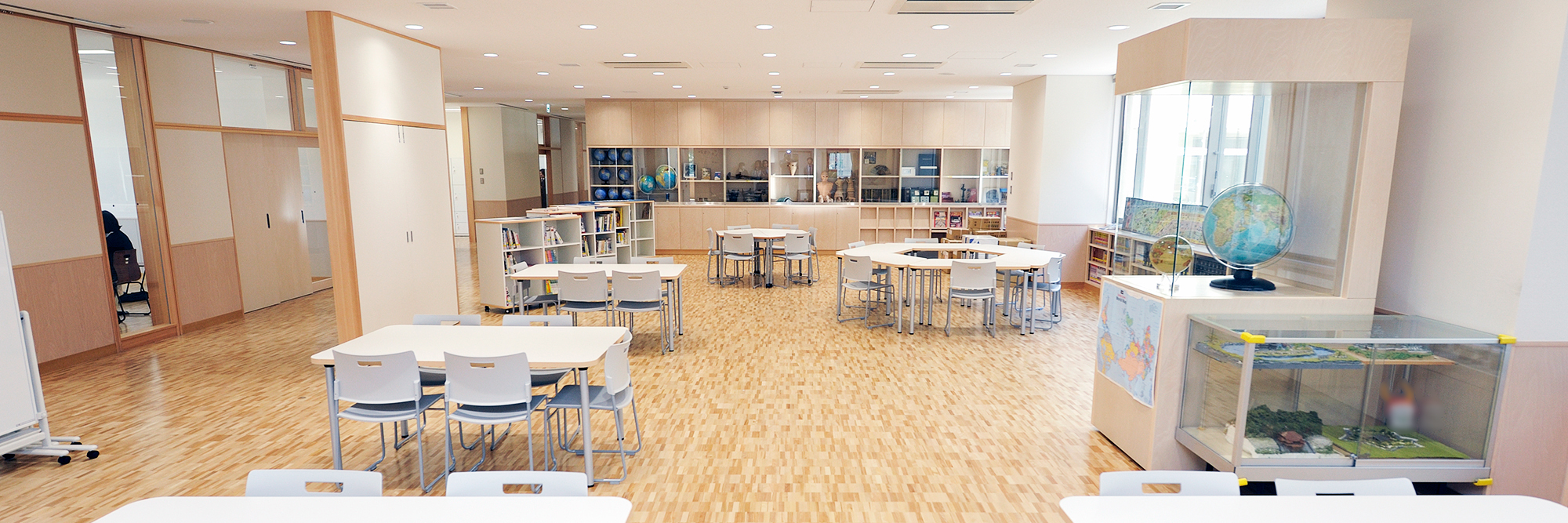 メディアスペースには、展示物、書籍、グループ学習用のテーブル、発表用のボードなどが整備されます。隣接する教室の扉を開放することにより、教室+メディアスペースという空間で学習することができます。