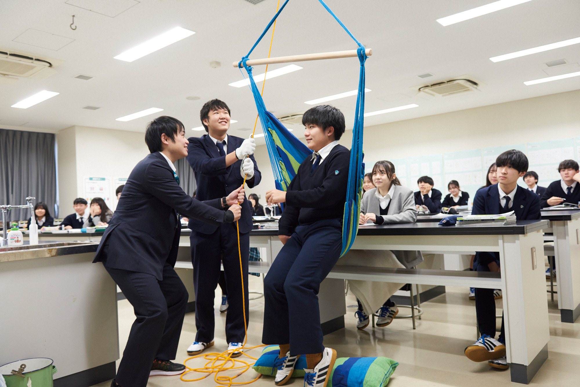 動滑車とハンモックを使用し、腕の力で座っている人を持ち上げる実験を通し、道具の役割や仕事の原理を学びます。