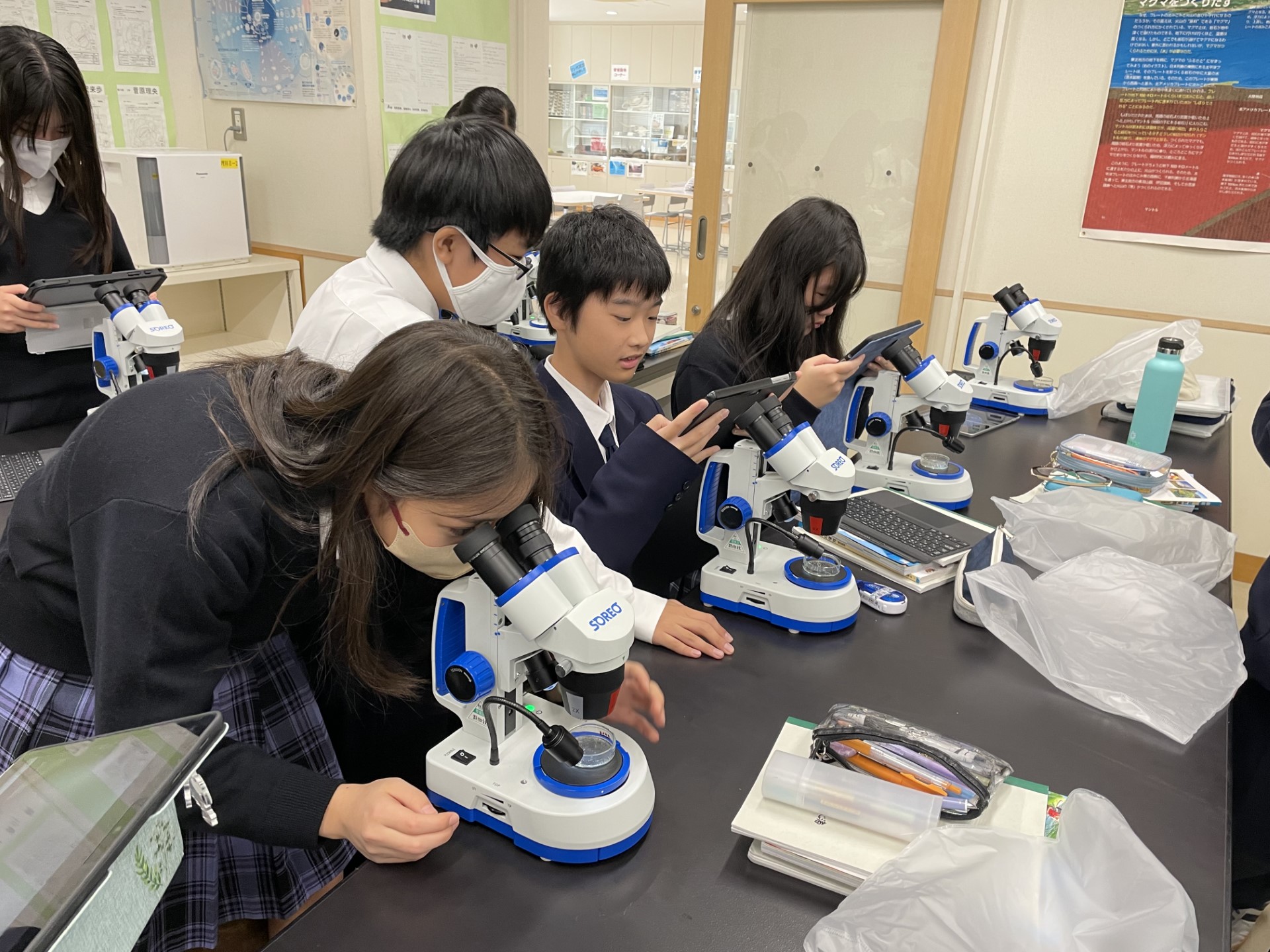 双眼実体顕微鏡を利用して火山灰を観察します。拡大して観察することで、小さくも美しい鉱物の世界を体感でき、鉱物の結晶の特徴について理解を深めます。